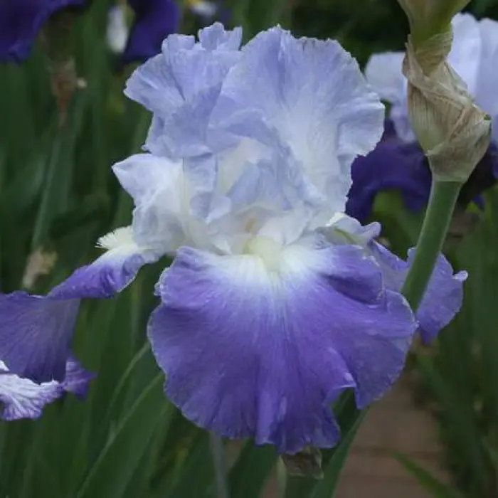 Ирис германский Clarence. Цветок крупный, верхние лепестки голубые, нижние лепестки синии, ярко-выраженной белой бородкой. Цветет с весны до середины лета по 7-10 бутонов на побеге. Повторно цветущий. Сорт обладает приятным ароматом. Место расположения солнечное с хорошим дренажем. Устойчив к засухе. Подходит для солнечных клумб, бордюров, рабаток, смешанных групп.