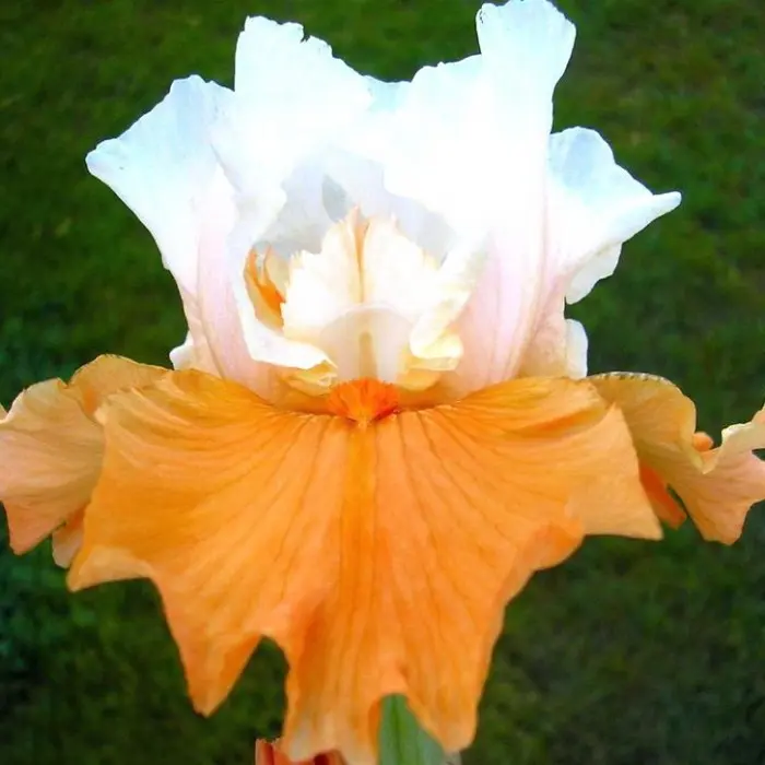 Ирис германский Pumpkin Cheesecake. Имеет цветок с белыми верхними лепестками и абрикосовыми нижними. Бородка мандариново-оранжевая. Листья прикорневые, линейные, собраны в основании в вееровидные пучки. Свою декоративность сохраняют до осени. Цветки крупные, красивой формы, расположены на длинных, крепких цветоносах. На одном месте может расти до 5 лет.