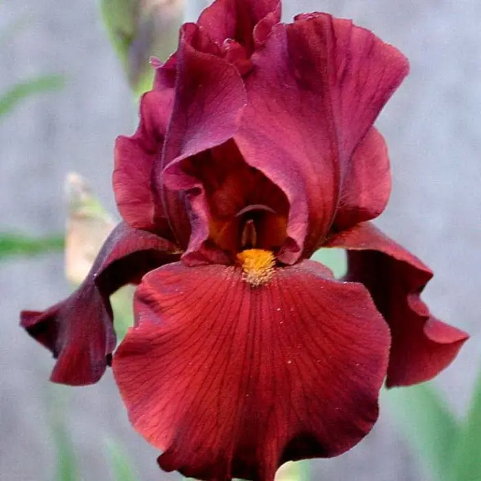 Ирис германский War Chief. Нижние доли (фолы) и верхние доли (стандарты) имеют одинаковую расцветку и окрашены в красно-рубиновый тон с тонкими полосками более темного цвета, по краю цвет становится более темным и насыщенным. Яркая расцветка смягчается матовой структурой лепестков. Бородка - ярко-желтая, резко выделяющаяся на темном фоне. Имеет высокие прочные цветоносы, на которых развиваются до 4 ветвей и более 10 бутонов, что гарантирует обильное пышное цветение.