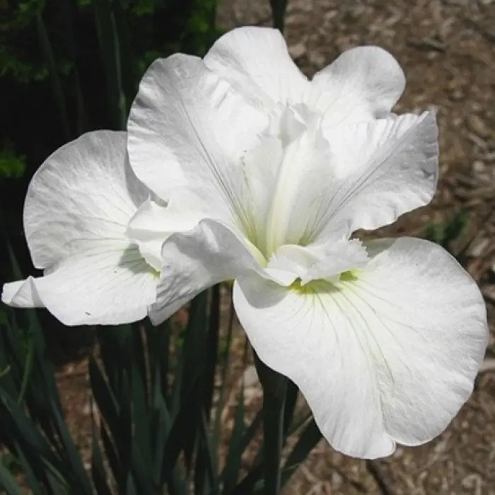 Ирис Gulls Wing. Одноцветный: чисто-белый с жёлтыми сигналами. Слегка гофрированные края долей околоцветника. Позднего срока цветения. Закрывает сезон цветения сибирских ирисов. Цветение: июнь-август. Один из самых элегантных белоцветковых сортов сибирских ирисов.? Обладают легким ароматом.