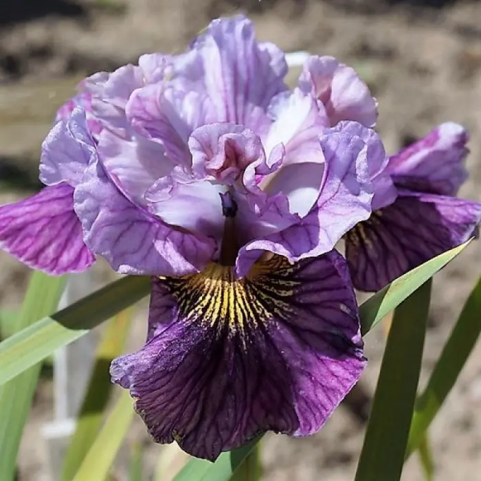 Ирис Mad Hat. Верхние лепестки лавандово-сиреневые, сильно гофрированные. Нижние лепестки фиолетово-лиловые с золотистой бородкой и прожилками. Очень обильное цветение. Цветет продолжительно 2-3 недели, с конца мая. Высота ириса сибирского "Mad Hat" составляет 60 см. Листва насыщенно-зеленого цвета, широкая, не жесткая.