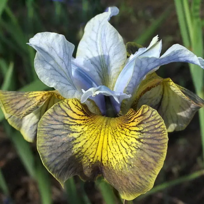 Верхние лепестки светло-голубые с бледно-желтыми оттенками и темными прожилками; лопасти столбика жемчужно-лавандовые с голубой центральной линией и небольшими желтоватми гребешками; нижние лепестки дымчато-синие, равномерно испещреные фиолетовыми прожилками, по мере старения цветка светлеют, края лепестков желтые; большой ярко-желтый сигнал. Ароматный. Цветок не крупный, но куст цветет очень обильно и продолжительно, стартуя одним из первых в группе, а последние цветы дотягивают до пика цветения поздних ирисов. Срок цветения ранний. Цветение в июне.