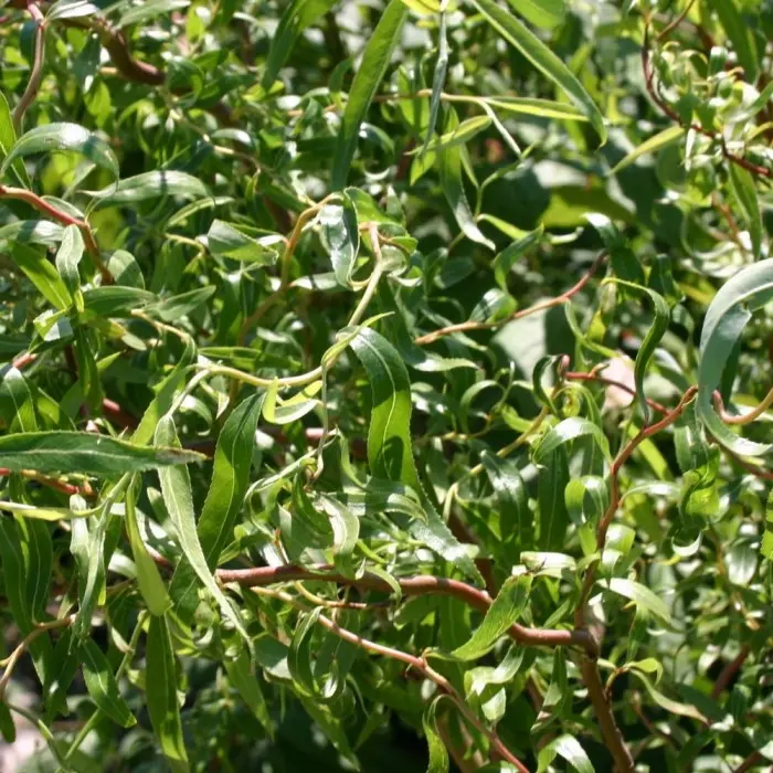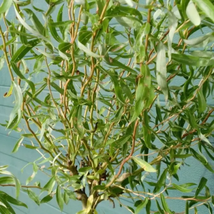 Ива Caradoc. Извилистая, удивляет всех, кто её видит впервые. Отличительная особенность - извилистые стволы, ветви, тонкие веточки и скрученные листья. Декоративность растения очень высокая. Побеги - змеевидно-изогнутые, очень декоративные; молодые побеги - имеют оранжево-красную кору, взрослые - кору красно-коричневого цвета.Очень декоративное стройное дерево с извилистыми ветвями, зелёными весной и оранжево-жёлтыми зимой. К 10-ти годам высота 8 м. Рост можно сдерживать ежегодной обрезкой, поощряя появление красивых молодых ветвей. Срезанные веточки – очень хороший материал для флористики. Листва зелёная, ланцетная, также извилистая, осенью ярко-жёлтая. Место солнечное, рядом с прудом или ручьём. Почва постоянно влажная. Зона 3 (до -34?С).
