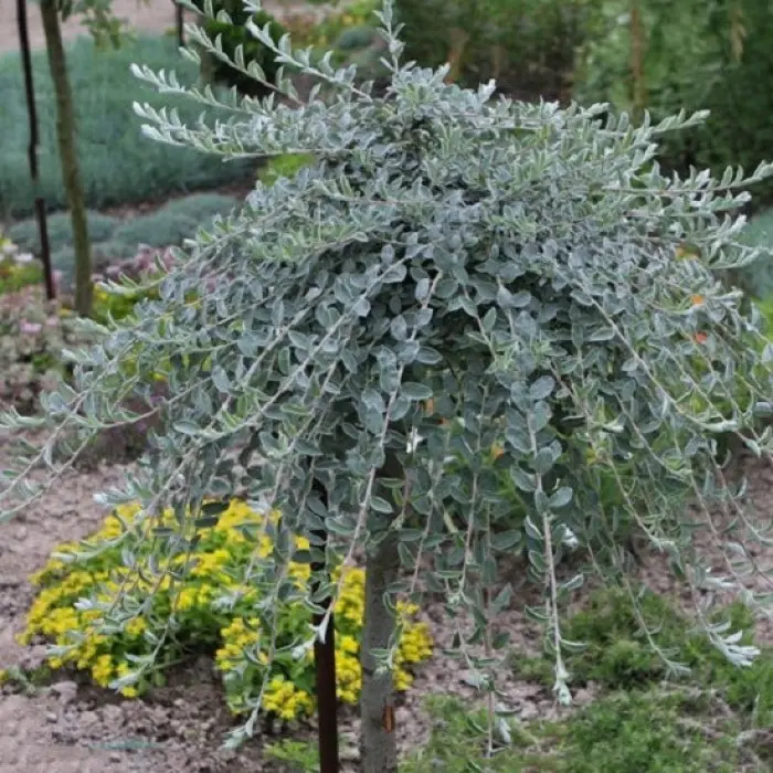 Карликовое ползучее растение высотой 120 см (зависит от высоты штамба) и до 1 м шириной, с раскидистой кроной и стелющимися ползучими ветвями. Медленно растущее. Молодые побеги тонкие, войлочные, зеленовато-серые, позже черные, очень упругие. Листья мелкие, эллиптические до овальных, сверху – сизо-зеленые, с нижней стороны густо покрыты серебристо-шелковым опушением. Осенняя окраска листьев бледно-желтая. Цветущие сережки вначале слабо серебристые, при распускании – желтые, ароматные, появляются до распускания листьев. Декоративна густой, распростертой кроной со стелющимися ветвями и серо-серебристой, опушенной листвой.
