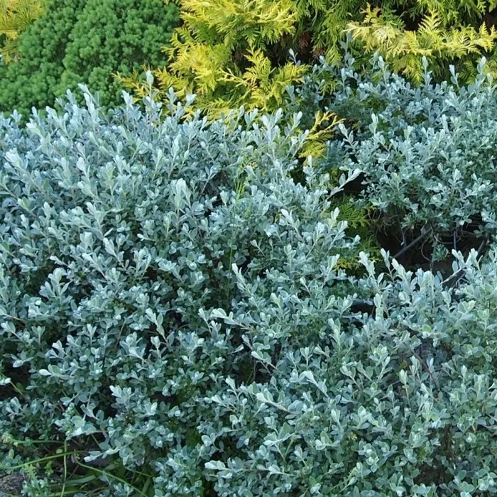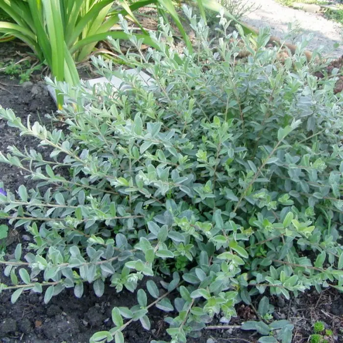 Ива ползучая. Густоветвистый кустарник с ползучими ветвями и восходящими вверх побегами, может достигать 1,5 м. Достаточно быстро растёт, образуя со временем широкие куртины. Листья с постоянным серебристым опушением с обеих сторон листа. Чаще в культуре встречаются мужские образцы, которые в период цветения, в середине мая, становятся очень декоративными из-за обилия мелких ярко-жёлтых серёжек.