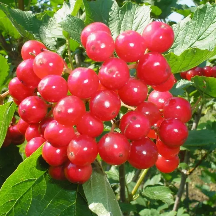 Калина обыкновенная Granatovyj braslet. Среднерослое растение высотой около 200 см обладает среднераскидистой шаровидной кроной диаметром 200 см. Белые цветы собраны в щитковидные многоцветковые соцветия, аромат отсутствует. Грозди плодов большие. Ягоды крупные (до 1,8 см), овальные, у вершины слегка вытянутые, массой около 0,8 г, тёмно-красные. Кожица плотная. Мякоть сочная, обладает кисло-сладким вкусом с приятной горчинкой. Дегустационная оценка плодов – 4,3 балла. Основные достоинства сорта: хорошая урожайность и устойчивость к заболеваниям и вредителям. Плоды используют для переработки и употребления в свежем виде.
