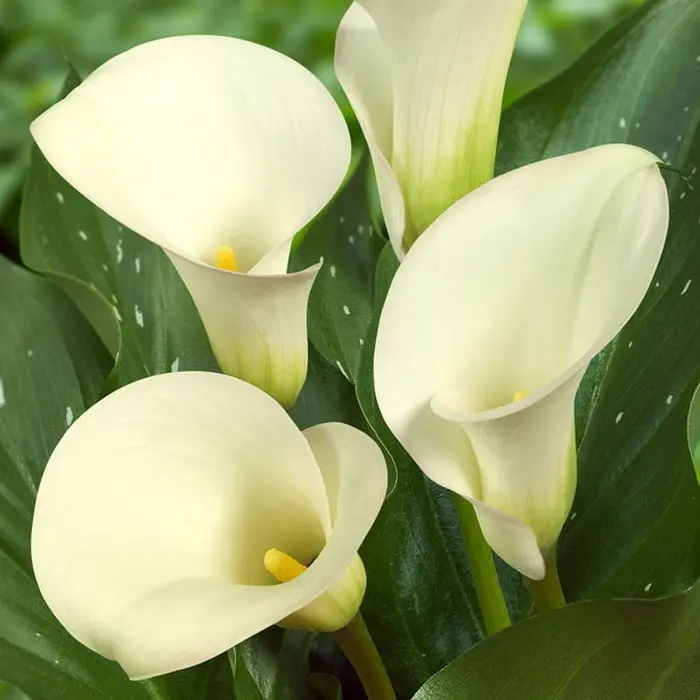 Калла Captain Ventura. Разбор 12/14. Многолетнее травянистое растение с клубневидным корневищем. Высота растения 40-50 см. Соцветие каллы одиночное, белого цвета с восковым отливом, в форме початка, окруженного крупным воронковидным листом. Сочно-зеленые листья с серебристо-белыми вкраплениями имеют стреловидную форму. Предпочитает солнечные места.