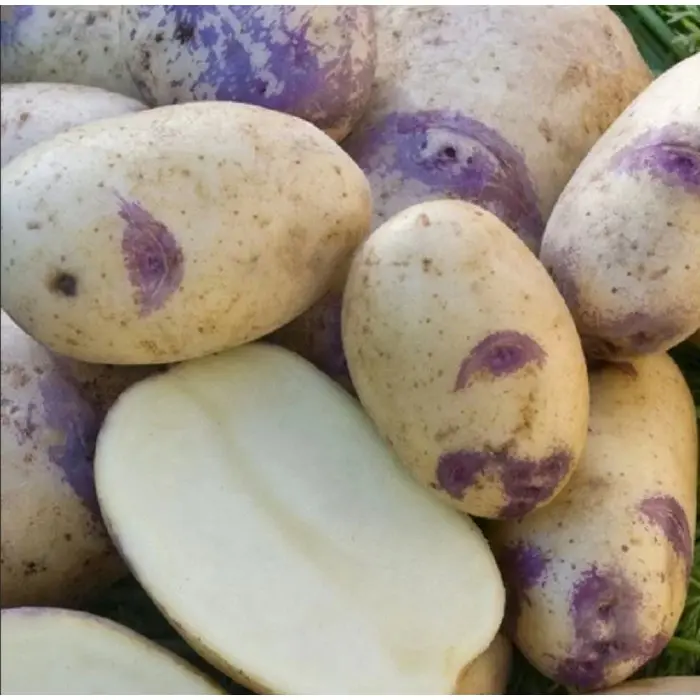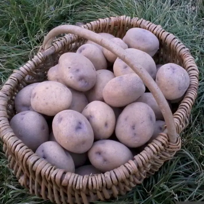 Клубни имеют ровную, округлую, слегка приплюснутую форму. На поверхности клубней имеются характерные сиреневые глазки.