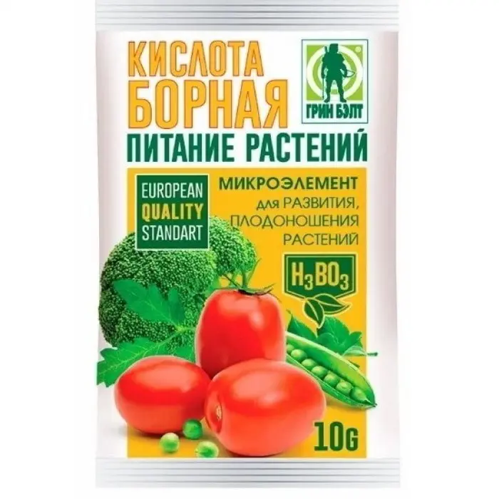 Препарат содержит микроэлемент бор, необходимый растениям в течение всего вегетационного периода. При недостатке бора нарушаются рост и развитие органов плодоношения растений.Подкормка микроудобрением, содержащим бор, увеличивает урожайность, способствует увеличению содержания сахара, витамина С и каротина в плодах, повышает интенсивность цветения цветочных культур.