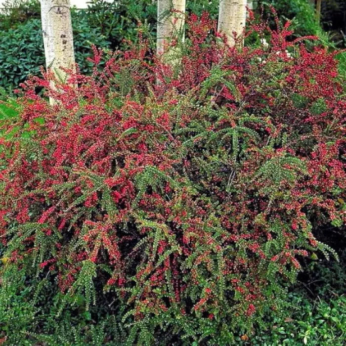 Кизильник горизонтальный. Это вечнозеленый кустарник высотой до 50 см, с горизонтально распростертыми, почти прижатыми к земле перисто-ветвистыми побегами, расположенными в одной плоскости. Замечательны его мелкие, почти округлые, до 1,5 см, темно-зеленые листья, пурпуровые осенью. Растет быстро и сильно разрастается вширь, диаметр кроны более 1 м. Один из изящнейших видов.