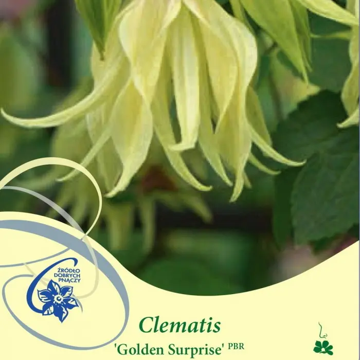 Клематис Golden Surprise. Красивый польский сорт с махровыми и полумахровыми светло-желтыми, колокольчатыми цветками, с ароматом грейпфрута. Цветет наиболее обильно в мае-июне. В саду он может расти с различными типами опор или может переплетаться с лиственными и хвойными кустарниками. Цветки среднего размера 7-9 см, на пурпурных цветоножках. Тычинки с жёлтыми пыльниками на зелёно-жёлтых тычиночных нитях и жёлтым пестиком. Листья сложные тройчатые с зубчатыми краями. Растет умеренно сильно. Высота 250-300 см. Любит хорошо освещенные места. Зона 4 (до -29?С). Группа обрезки 1.