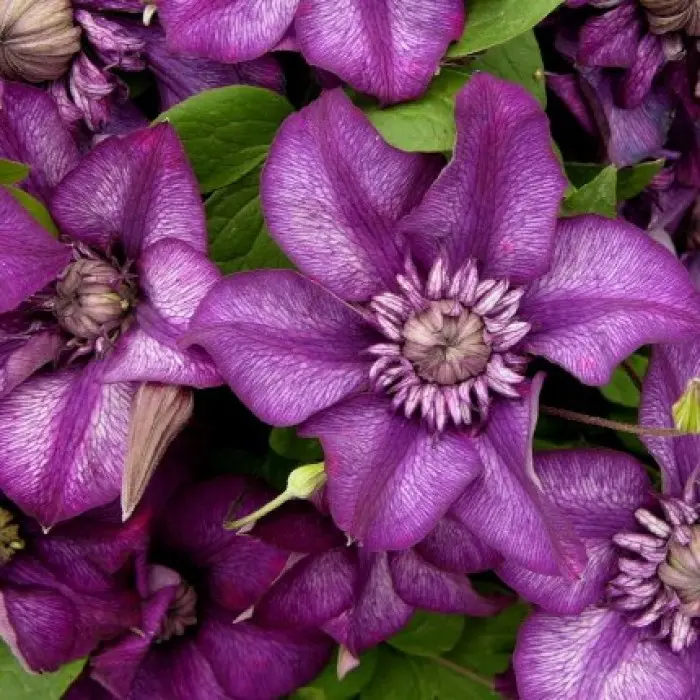 • махровые сливово-фиолетовые цветы в диаметре до 10 см с 6 наружными чашелистниками держатся долго, благодаря медленно раскрывающейся серединке;