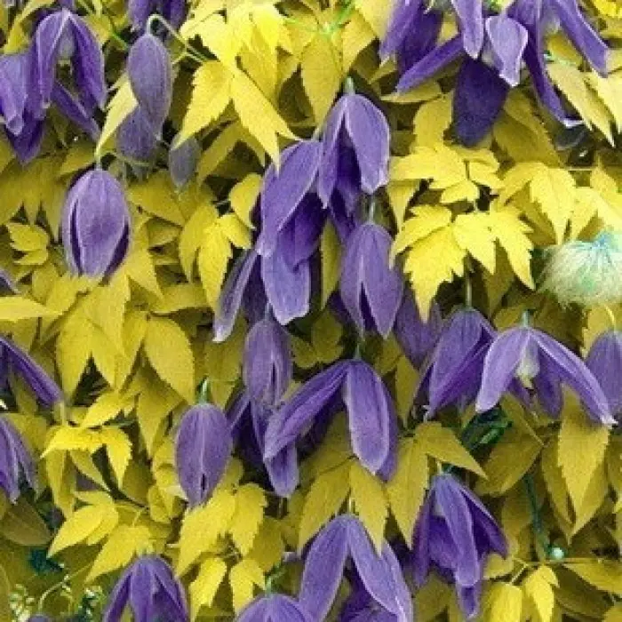 Клематис Stolwijk Gold. Саженцы клематиса гибридного Столвик Голд высаживают на солнечные или полузатененные участки с влажной, плодородной почвой. Взрослое растение достигает в высоту 200-300 см, при помощи листовых черешков цепляется за поверхность, расположенных рядом объектов. При отсутствии опоры побеги стелются по поверхности почвы. Клематис гибридный Столвик Голд (Stolwijk Gold) не теряет декоративных качеств в течение всего сезона, благодаря золотисто-желтой листве, которая контрастно сочетается с фиолетово-голубыми цветками и светлыми пушистыми соплодиями. Цветки в диаметре достигают 5-6 см, широко раскрытые по форме напоминают колокольчик. Цветет обильно, начиная с конца апреля и на протяжении мая. В течение лета цветение повторяется. Зона морозостойкости 4. Группа обрезки 1.