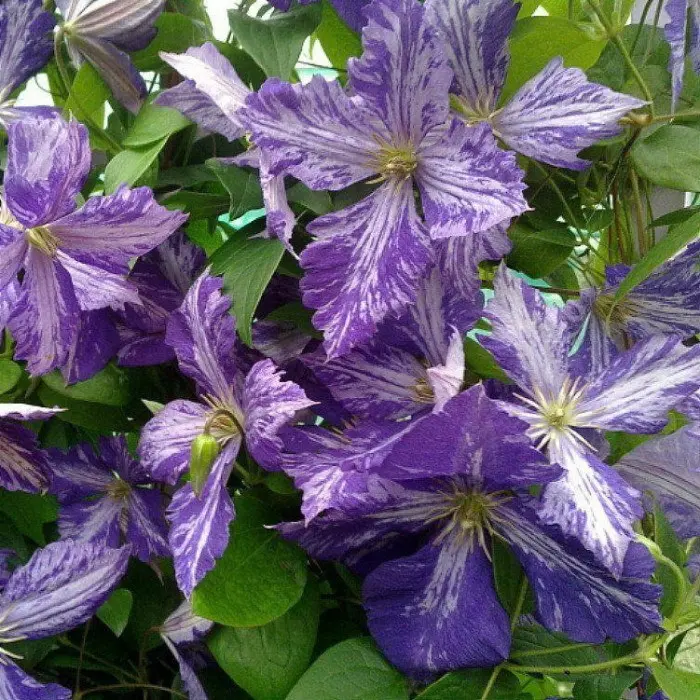 Клематис 'Тай Дай' - крупноцветковый поздний сорт. Крупные ярко-фиолетовые цветки с бледно-лавандовыми штрихами на белом создают неповторимый мраморный рисунок. Он начинается в центре каждого лепестка и перьями распространяется к краям. Пыльники красные на светло-зеленых тычиночных нитях.