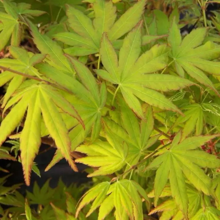 Клен дланевидный / веерный Katsura. Великолепная карликовая форма. Вазообразный кустарник или небольшое деревце, к 10-ти годам высота 180 см. После достижения высоты 2 м начинает расти вширь. Листья пятилопастные, длиной всего лишь 3-4,5 см, мелкозазубренные по краю, при распускании зеленовато-жёлтые с оранжевыми краями, затем светло-зелёные, осенью ярко-оранжевые. Черешки листьев красноватые. Цветёт в апреле-мае. Цветки маленькие красноватые. Требует полутенистых, тёплых, защищённых от ветра мест, плодородной, влажной, хорошо дренированной почвы и ежегодного мульчирования.