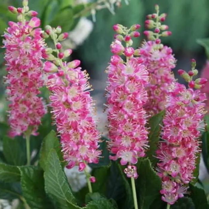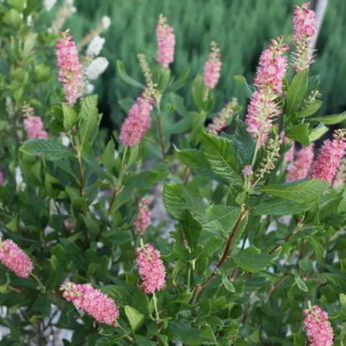 Клетра ольхолистная Pink Spire. Кустарник высотой 90-150 см, шириной 120-180 см. Незаменим для посадок в сезонно мокрых полутенистых низинах с кислой дренированной почвой. Также хорошо растёт на солнце и в тени. Цветки кремово-розовые, очень душистые, в свечевидных соцветиях длиной 15 см. Цветение в августе на побегах текущего года. Листья тёмно-зелёные, глянцевые, зубчатые, появляются только в конце мая, а осенью желтеют и долго не опадают. Место защищённое, полутенистое, зона 4 (до -29?С). Молодые растения нуждаются в зимнем укрытии, затем зимостойкость растений повышается.
