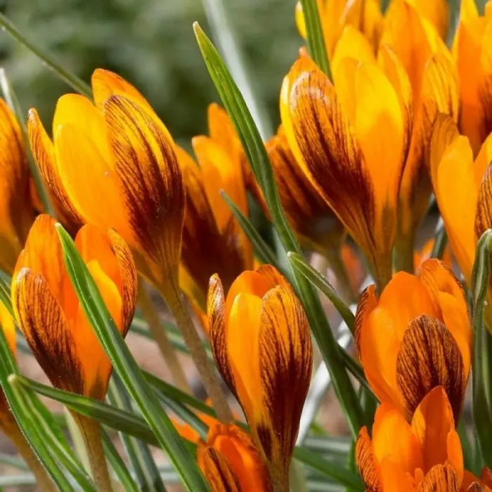 Crocus Botanical Orange Monarch. Один из самых крупных сортов крокуса золотоцветкового. Окраска цветков снаружи ярко-оранжевая с элементами темно-бордового меланжа, а изнутри – желтая, что создает сказочную игру красок. Обильное цветение происходит сразу же после схода снега. Если на улице пасмурно, лепестки цветков крокуса остаются сжатыми и раскрываются только в солнечную погоду.
