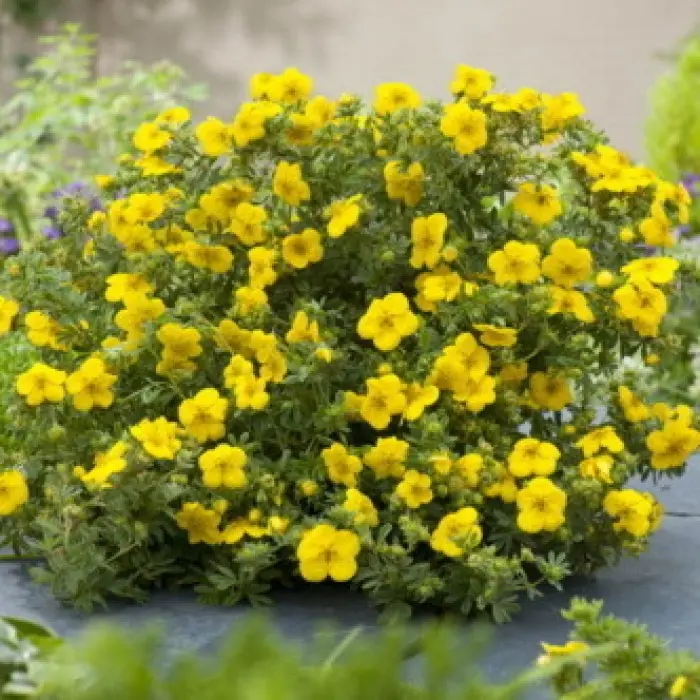 Лапчатка кустарниковая Hendlin Bella Lindsey. Куст компактный, густой, высотой и шириной 60-80 см. Не требует обрезки. Цветки ярко-жёлтые, не выгорают на солнце, осенью медленно приобретают тёплый оранжево-жёлтый оттенок. Цветёт обильно и длительно, с конца июня по сентябрь. Листья тёмно-зелёные, устойчивые к болезням и вредителям. Идеальный сорт для патио, контейнеров и бордюров. Место солнечное. Почва дренированная. Зона 2 (до -40?С).