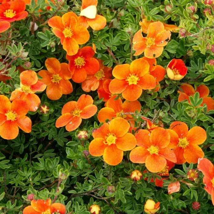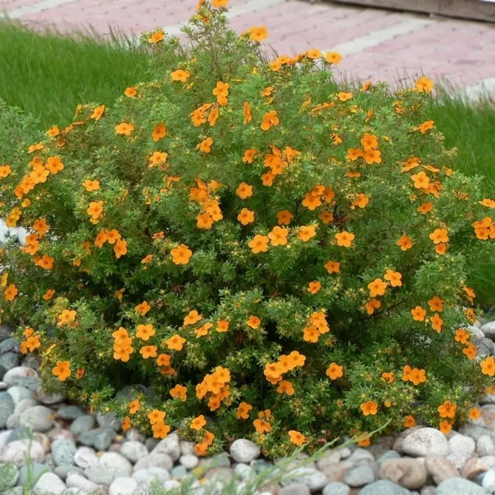Лапчатка кустарниковая Orange Star. Невысокий красивоцветущий кустарник высотой до 60 см с плотной, аккуратной, компактной, подушковидной кроной, перистыми серо-зелеными листьями. Цветет обильно и продолжительно до самой поздней осени. Цветки оранжевые, крупные, диаметром до 4 см. Они могут быть, как одиночные, так и собранные в небольшие соцветия.