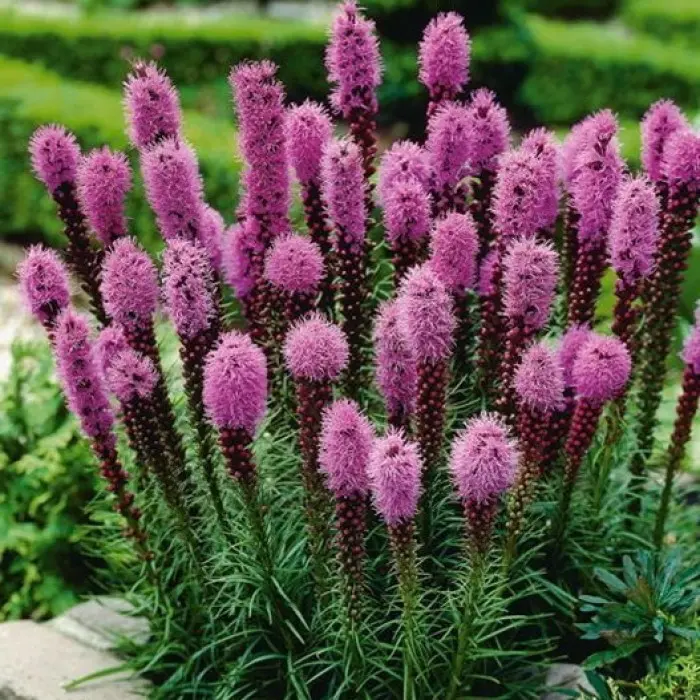 Лиатрис колосковый Floristan Violett. Многолетник высотой до 80 см с широкими пушистыми колосьями светло-сиреневого цвета и плотными прямостоячими стеблями густо покрытыми узкими и длинными листьями светло-зеленого цвета. Цветение начинается в июне или июле и продолжается несколько недель.