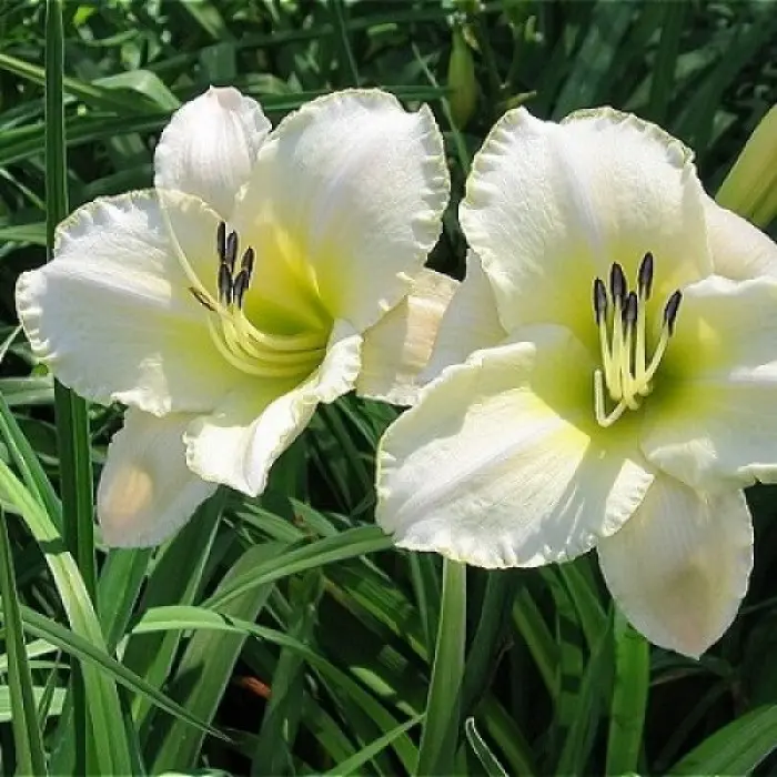 Высота растения до 60 см. Цветок цвета слоновой кости с зеленоватым горлом и яркими черными пыльниками до 14 см в диаметре, гофрированный.
