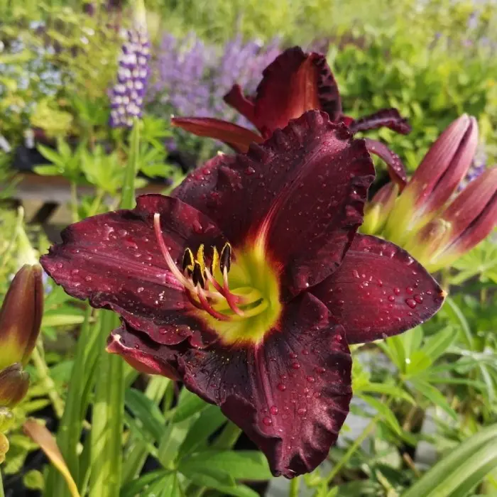 Лилейник Bela Lugosi. Высота этого сорта достигает 85 см, ширина куста – до 65 см. Цветы до 15 см в диаметре, отличаются необычайно яркой, насыщенной расцветкой темно-вишневого, почти бордового оттенка с золотисто-салатовым зевом. Широкие, плотные лепестки имеют гофрированную кайму по краям.