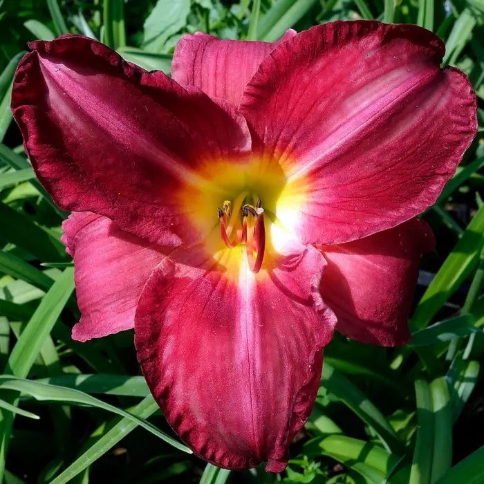 Лилейник Charles Johnston. Цветы красивые, пурпурно-красные, с жёлтым, ярким горлом, размером 15см и широкими, изогнутыми лепестками, с гофрированными краями. цветение с июля очень обильное и продолжительное, повторное во второй половине августа. лист неширокий, удленённый, зелёный. Куртина густая, мощная, высота до 60см. Неприхотлив, может расти в любом месте. отличается быстрым ростом. В тенистых местах окрас цветов более тёмный и цветение длится дольше. Укрытия не требует.