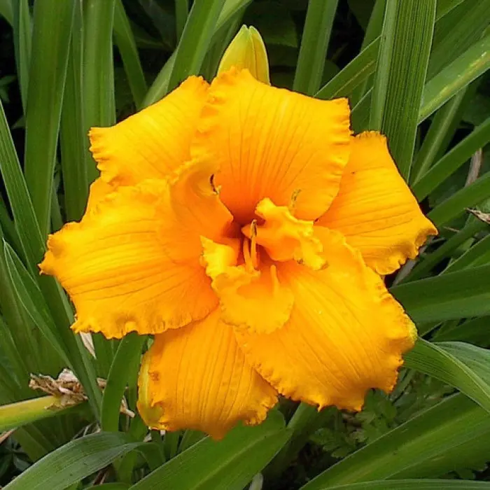 Махровый, золотисто-оранжевый, диаметр цветка 12 см. Лепестки имеют гофрированные края. Достаточно ранний сорт лилейников, можно начать любоваться цветами уже в начале июня. Сам куст состоит из прикорневой листвы светло-зелёного цвета, по высоте он не более 50-55 см.
