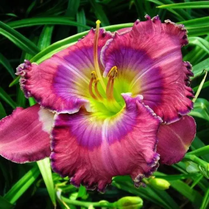 Лилейник Lavender Blue Baby. Цветок гофрированный, ярко-сиреневый с фиолетовым кольцом и каймой, зеленое горло. Спящий, диплоид, тип цветения дневной. Период цветения июль-август. Ароматный; повторное цветение. Зона зимостойкости: 3 зона.