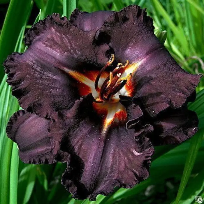 Простая форма цветков компенсирована бархатистой поверхностью лепестков, выкрашенных в оттенок черного винограда и хорошо гофрированных.
