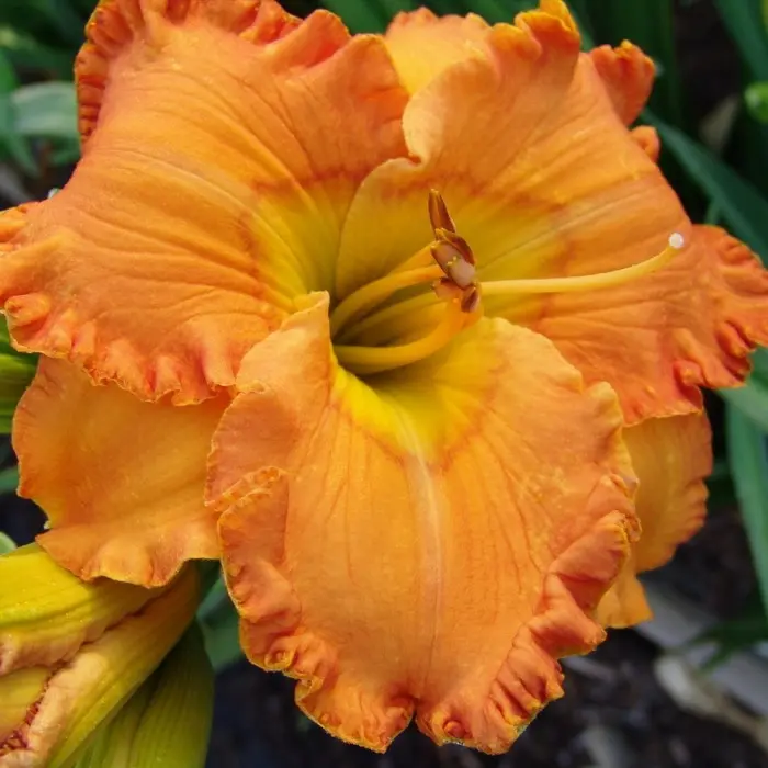 Крупные цветки дынно-апельсиновых оттенков с пышным кружевным краем смотрятся в саду эдакими тропическими гостями, мгновенно заряжая сад энергией жизни и радости. Многочисленная солнечная делегация прибывает в начале июля, а затем повторно в конце лета, но... в уменьшенном составе. Взрослый куст дает около 250 бутонов за сезон.
