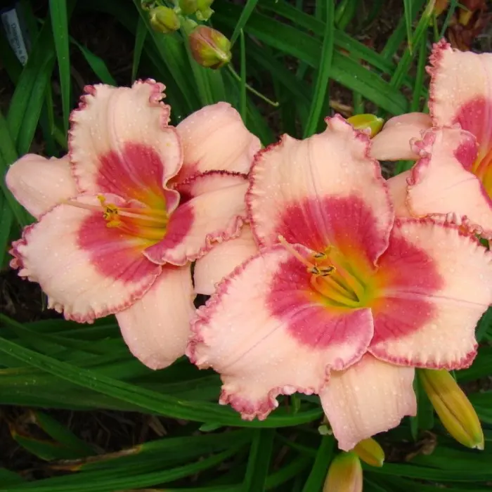 Лилейник Strawberry Fields Forever. Вечнозеленый, тетраплоид. Высота растения 65 см. Розовый цветок диаметром 10 см с ярким землянично-розовым глазом и широкой гофрированной каймой на внутренних лепестках, зеленое горло. Душистый. Срок цветения среднеранний (конец июля). Повторноцветущий. Зона зимостойкости 3 (-40 / -34 °C)