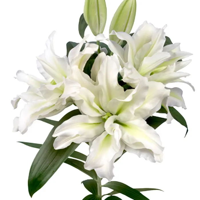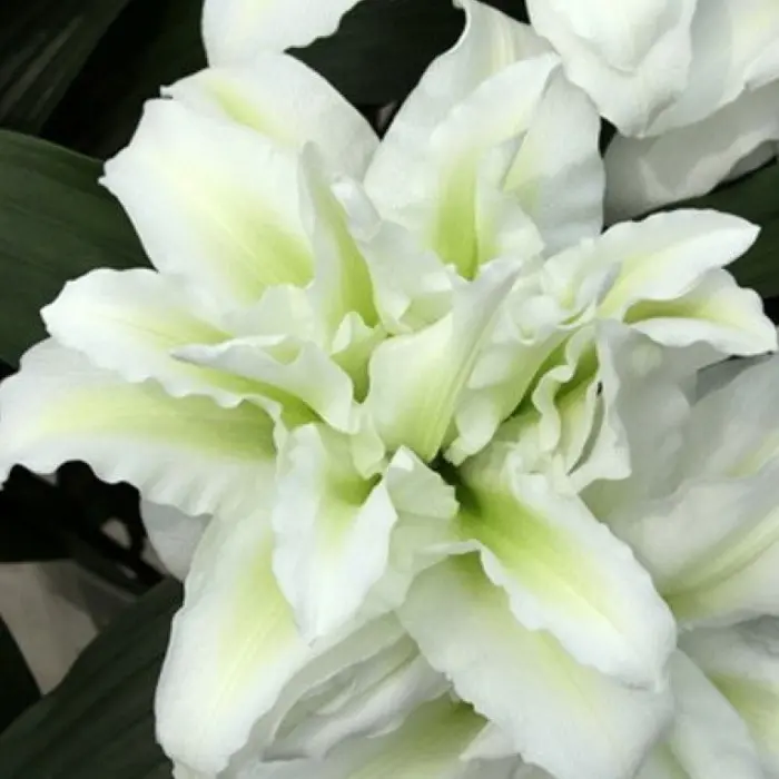Лилия Aisha розовидная восточная. Разбор 12/14. Это уникальный шедевр из серии гибридов RoseLily. Селекционеры на красоту лилии наложили достоинства розы. Из луковицы быстро вырастает метровый стебель. На нем распускаются несколько больших густомахровых бутонов. Цветки чашевидной формы до 20 см в диаметре с множеством волнистых по краям лепестков. Светло-салатовая сердцевина только подчеркивает белизну основного цвета. Период цветения июль-август.