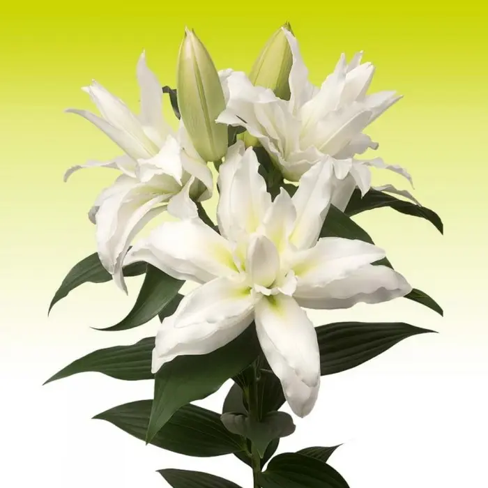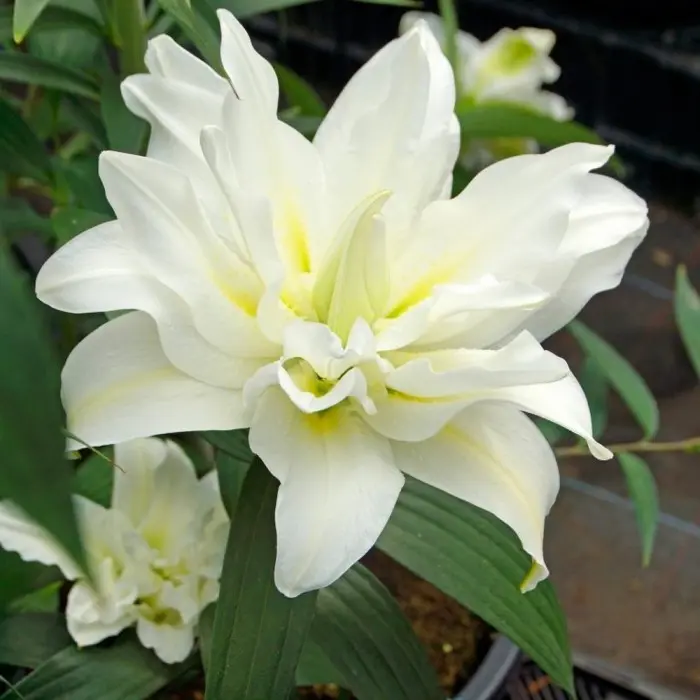 Лилия Arosa восточная махровая. Разбор 12/14. Белая махровая лилия с желтоватым центром. Цветы ароматные диаметром 21 см, высота 110 см. Всем восточным лилиям необходимы солнце или полутень, сухая хорошо дренированная почва, регулярные подкормки комплексными удобрениями. Зимуют восточные лилии в сухой почве с укрытием.