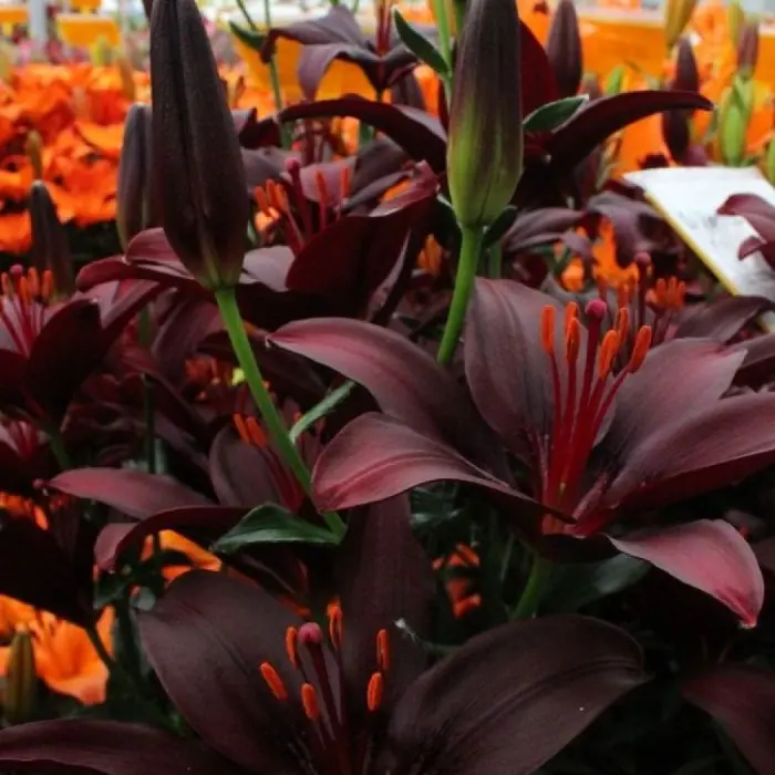 Лилия Dark Sekret азиатская. Разбор 12/14. Цветки лилиецветные, 20 см, воронковидные, одиночные, или собраны в пирамидальные соцветия, расположены на конце цветоноса, лепестки цветка восковидной фактуры. Цветение обильное и продолжительное, декоративность сохраняется до конца осени. Высота растений 110 см, окраска цветка темно-бордовая, почти черная, пурпурная, середина чуть зеленовато-белая, пыльники желтые.