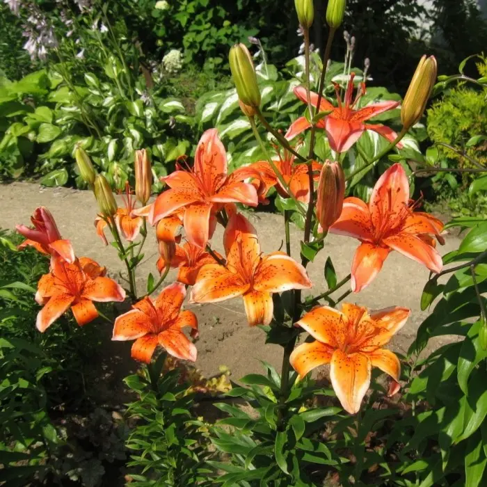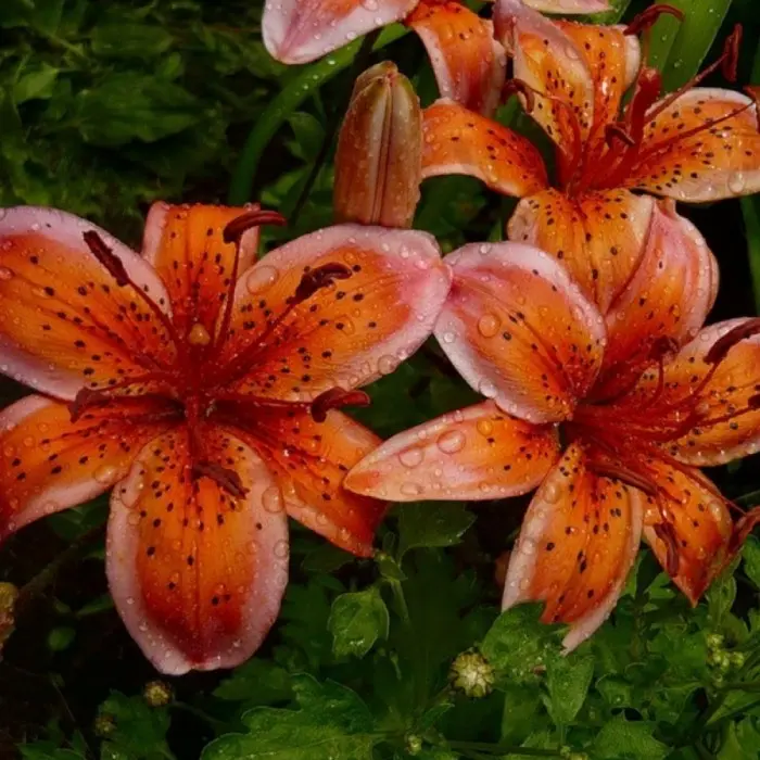 Лилия Electric (разбор 12/14). Цветки диаметром 15 см, оранжевые, с узким белым краем, крап, растущие вверх и в бок. Лилия зацветает в конце июня-первой половине июля. Высота растения 120 см. Время посадки осенью - август-сентябрь или весной - в мае. Глубина посадки - 15-20 см. Расстояние между луковицами - 25-35 см. Расположение для посадки - открытые и затенённые места. Растение требует укрытия в первый год. Предпочитает нейтральную или слабокислую хорошо дренированную почву. Лилия Электрик неприхотливая, устойчивая к грибным заболеваниям, зимостойкая.