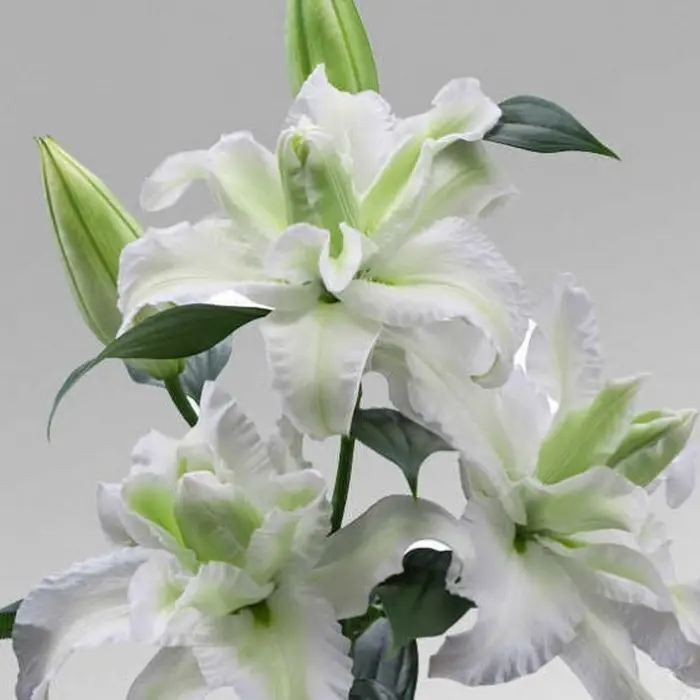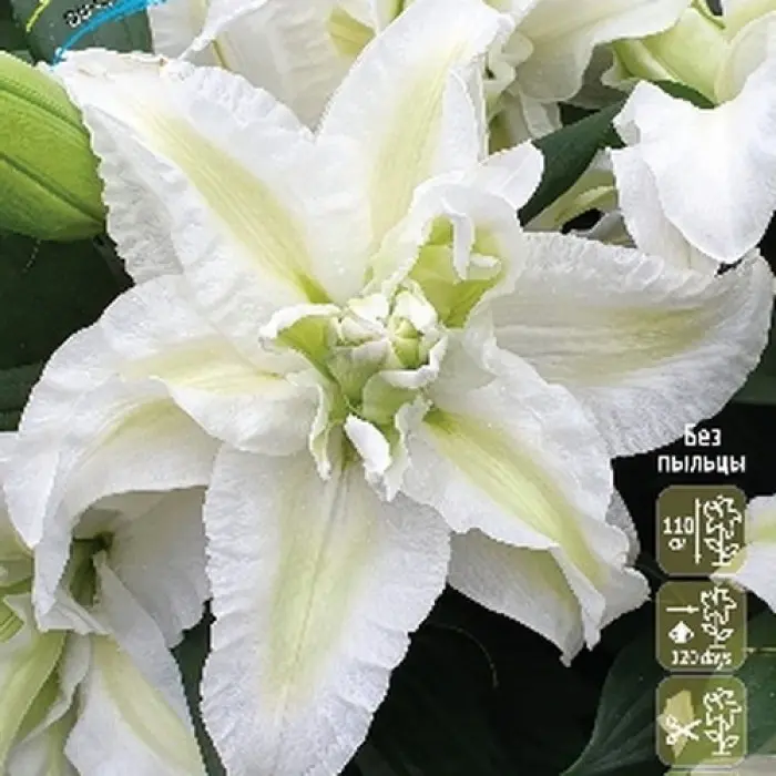 Лилия Empress восточная махровая. Разбор 12/14. Высота 100-110 см. Цветки белоснежные с салатовым центром, крупные, диаметром до 20 см. Цветение в июле-августе. Предпочитает солнце или полутень, сухую хорошо дренированную почву, регулярные подкормки комплексными удобрениями.