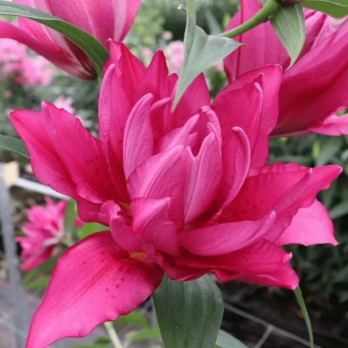 Лилия Floretta розовидная восточная. Разбор 12/14. Розовидная восточная лилия с объемными махровыми цветками диаметром до 21 см. Флоретта ярко-малиновая лилия с темно-малиновым редким крапом, без пыльцы. Имеет очень необычную для лилий почти бокаловидную форму цветка и перистые концы на внутренних лепестках, как у попугайных тюльпанов. Цветы ароматные. Высота 100 см.