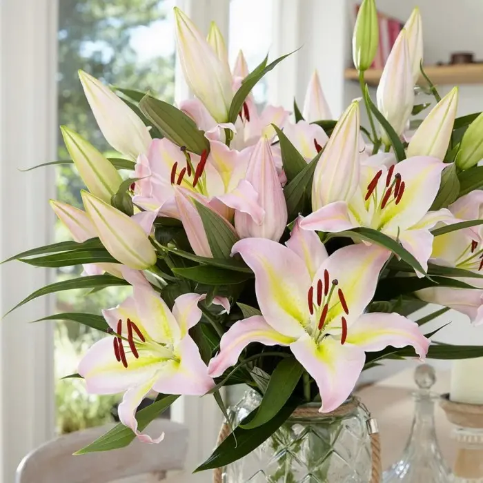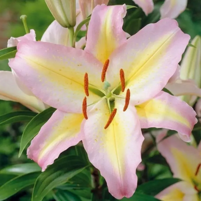 Лилия Hocus Pocus восточная. Разбор 12/14. Сорт относится к наиболее крупным сортам - диаметр цветка до 30 см. Они нежно-розовые, с легким сиреневым оттенком, по центру лепестков широкие желтые продольные полосы, лепестки немного гофрированы и загнуты кзади. Бутоны появляются в июле и сразу привлекают к себе внимание приятным ароматом. Высота растения до 120 см. Данная лилия также ценится за её неприхотливость к условиям содержания.