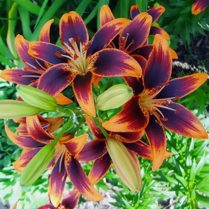 Лилия Forever Susan азиатская. Разбор: 12/14. Одна из последних новинок. Цветок бордовый с оранжевыми кончиками лепестков. У самого центра горла оранжевая с бордовым крапом чашечка. На солнце лилия может отливать фиолетовым цветом. Высота растения 60-90 см. Цветки лилии 12-15 см в диаметре. Нежный аромат. Период цветения июль.