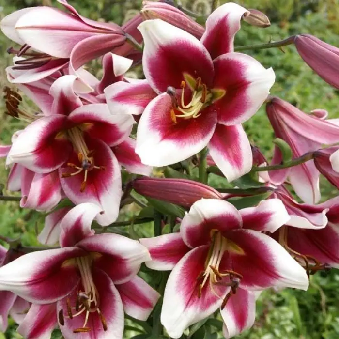 Разбор: 12/14. Цвет: вишневый с широким белым краем. Цветки диаметром 20 см, кремово-белые с насыщенно-пурпурно-красным центром, горло ярко желтое.