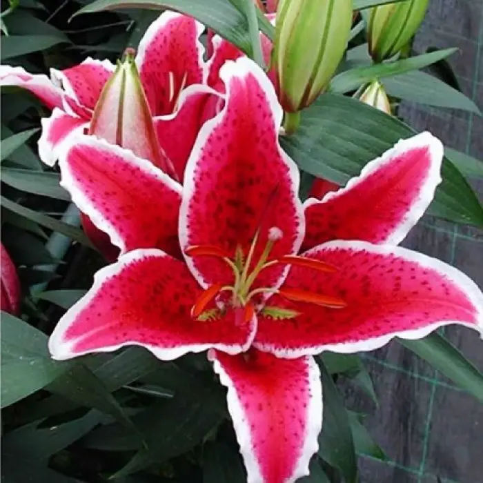 Разбор 12/14. Одна из самых крупных лилий в этой группе. Цветки ярко-розовые (красные) с фиолетово-розовым насыщением по центру и белой каймой, лёгкое гофре с многочисленными бордовыми точками, лепестки звездчатой формы со слегка завернутыми кончиками. Диаметр цветка 25 см, форма звездчатая, направлены вверх. Сильный аромат. Стебель мощный, 110-120 см высотой.