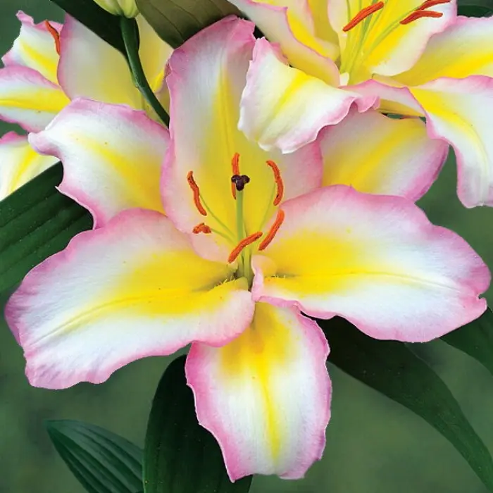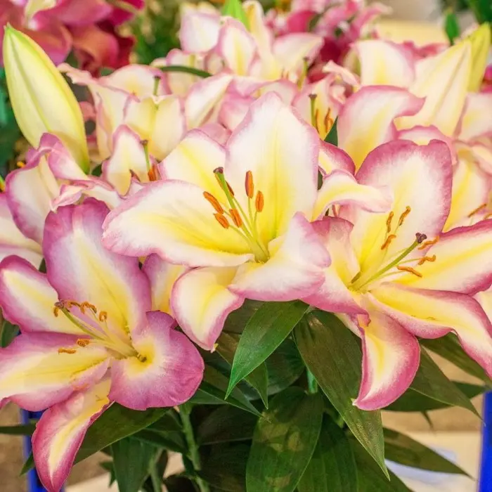 Лилия Capitan Tricolor восточная. Цветки лилиецветные, 20 см, воронковидные, одиночные, или собраны в пирамидальные соцветия, расположены на конце цветоноса, лепестки цветка восковидной фактуры. Цветение обильное и продолжительное, декоративность сохраняется до конца осени. Высота растений 1,20 м, окраска цветка белая, желтая полоса в центре, края лиловые, середина чуть зеленовато-белая, пыльники оранжевые. Зона зимостойкости 4.