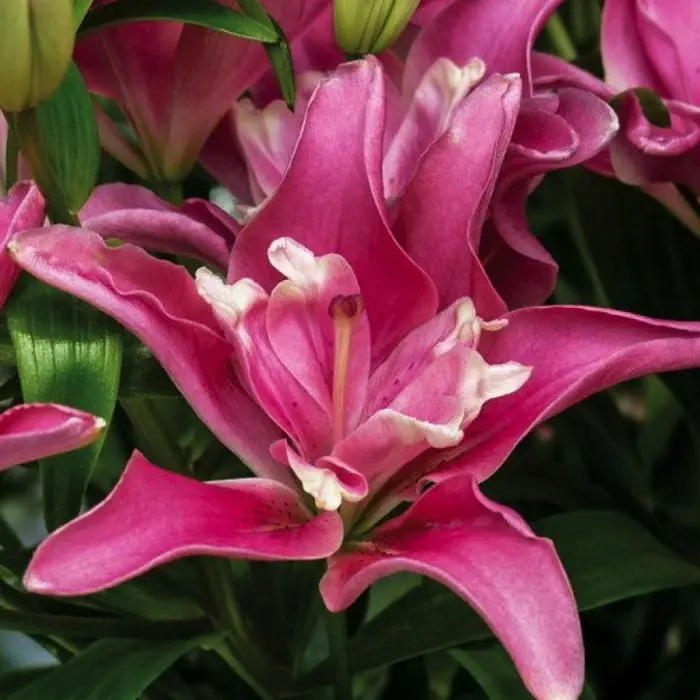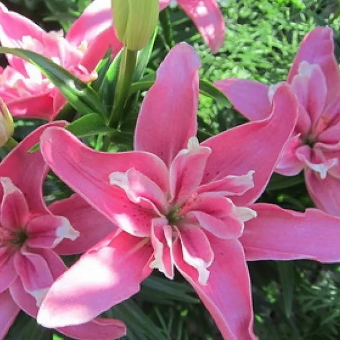 Лилия Candy Blossom. Разбор 12/14. Цветы махровые с лепестками жемчужно-розового, переходящего в чуть более насыщенный розовый к краям. Высота: 70-80 см. Диаметр цветка: 15 см. Неприхотливая, морозоустойчивая. Без запаха и пыльцы. Махровость показывает на второй год. Период цветения июнь-июль. Зона зимостойкости: 4 (-34 / -29 °C).