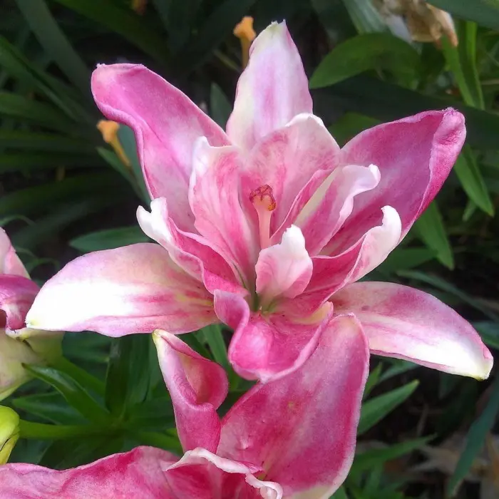 Лилия Candy Blossom. Разбор 12/14. Цветы махровые с лепестками жемчужно-розового, переходящего в чуть более насыщенный розовый к краям. Высота: 70-80 см. Диаметр цветка: 15 см. Неприхотливая, морозоустойчивая. Без запаха и пыльцы. Махровость показывает на второй год. Период цветения июнь-июль. Зона зимостойкости: 4 (-34 / -29 °C).