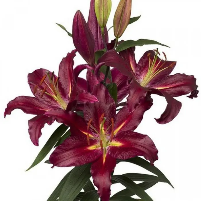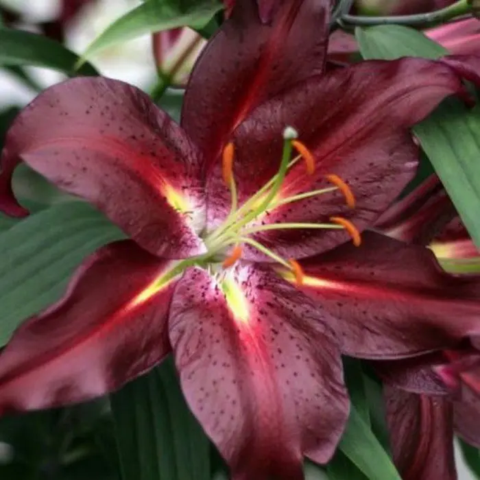 Лилия Commitment восточная. Разбор 12/14. Шикарная лилия с крупными цветками (диаметром до 20 см!). Окраска темно-бордовая, с желтой "звездой" у основания, поверхность лепестков глянцевая, придающая цветкам неповторимый блеск при любом освещении. Цветки направлены вверх. Имеет насыщенный аромат. Высота растения 120 см.