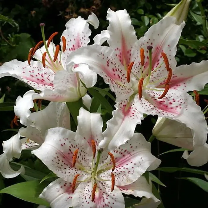 Лилии восточная Muscadet вырастают в высокие прочные растения с шикарными белыми соцветиями из атласных лепестков. Цветение сопровождается приятным ароматом. Гофрированные лепестки покрыты малиновыми веснушками и бледно-розовыми внутренними полосками. Стройные стебли усеяны изящными зелеными листьями.