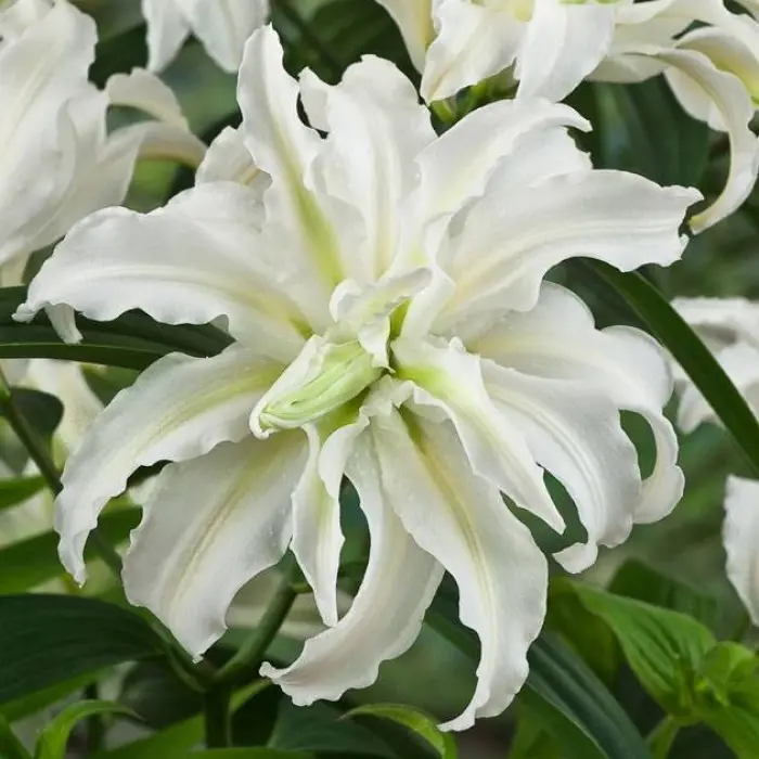 Лилия Polar Star восточная махровая. Разбор 12/14.Период цветения приходится с июля по август, образуя роскошные пышные цветы с нежным сладким ароматом диаметром 15-20 см белоснежного оттенка с нежно-желтым цветом в основании слегка волнистых лепестков. Лепестки нежные трехслойные, слегка закручены, благодаря чему цветок принимает привлекательную и пышную форму. Продолжительность цветения 2-4 недели. Высота растения 100 см. Зимостойкий сорт.