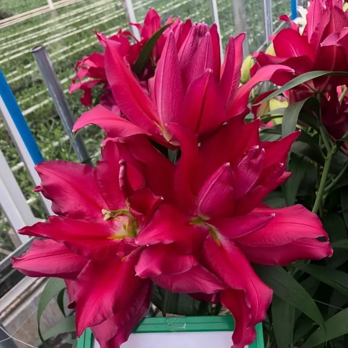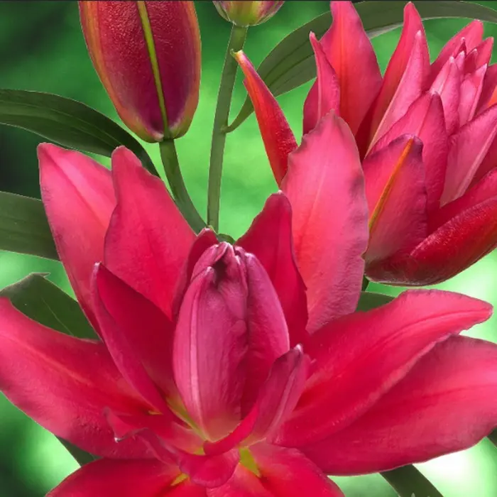 Лилия Roselily Rihanna (разбор 12/14). Сорт с крупными яркими густомахровыми цветами, без пыльцы. Высота взрослого растения 110 см. Диаметр цветка доходит до 18-20 см, лепестки атласные, малиново-красные. Цветение приходится на июль-август. Лилия морозостойка, нетребовательна в уходе, устойчива к заболеваниям. Хорошо растет на солнечных участках и в полутени, на питательной, рыхлой, дренированной почве.