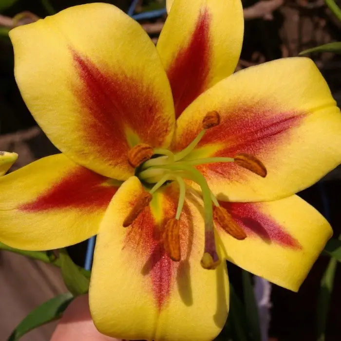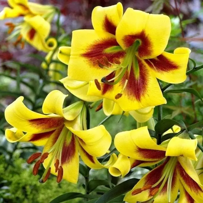 Лилия Robert Swanson ОТ-гибрид. Разбор 12/14. Высокорослый сорт с очень крупными лимонно-желтыми цветками. Образует крупные до 30 см в диаметре цветы. Окраска лимонно-желтого оттенка, а к центру переходит в рубиновое пятно. Лепестки атласные, сильно закручены. Цветение длительное, сопровождается сладким ароматом. Высота растения от 130 до 150 см. Цветет лилия в июле-августе.